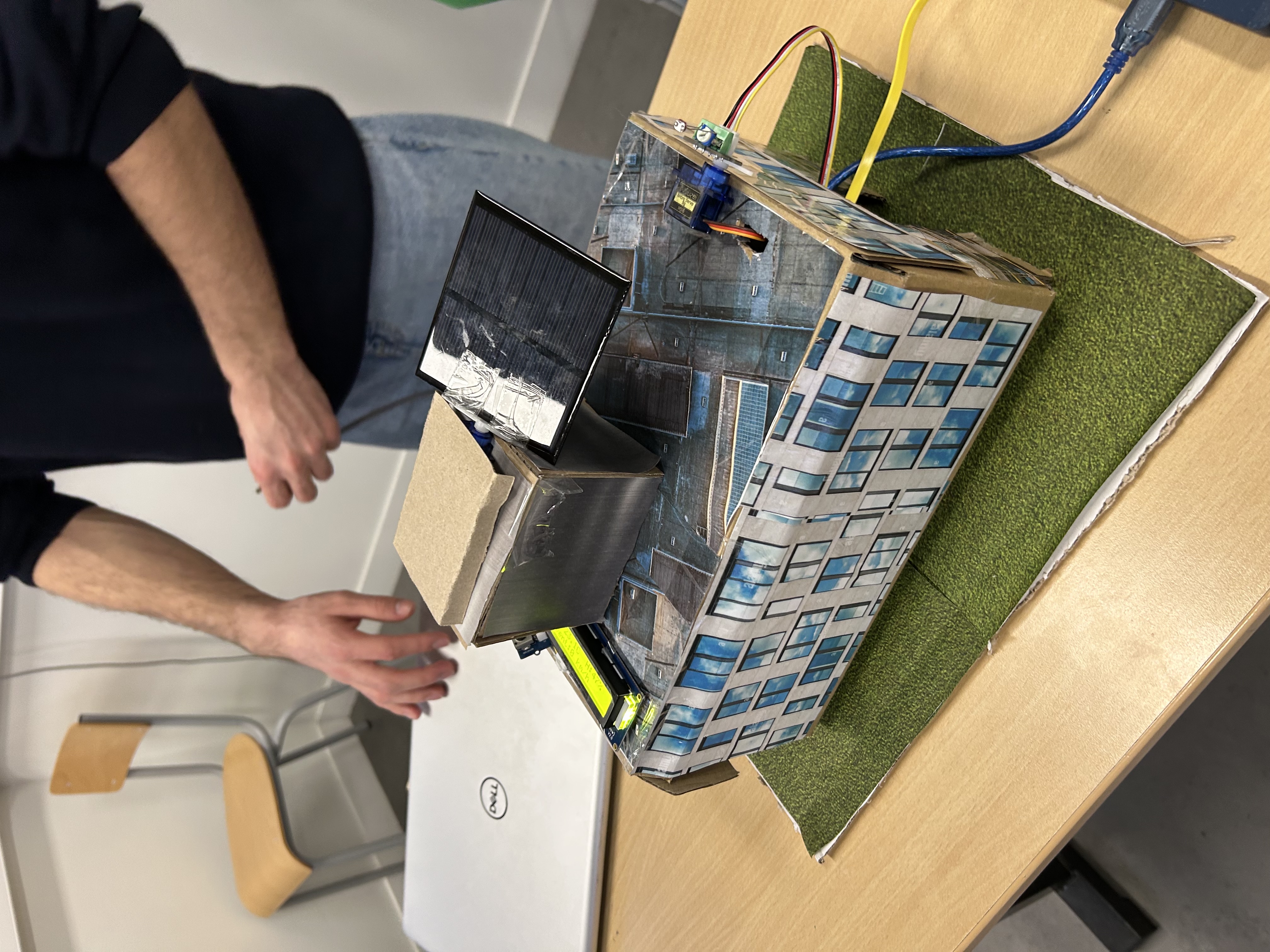 L’objectif global de cette réalisation est de illustrer le fonctionnement d’un système solaire autonome moderne, similaire à ceux que l’on retrouve aujourd’hui sur les toits plats des bâtiments industriels. Cette maquette met en avant la complémentarité entre électronique, programmation, capteurs environnementaux et conception mécanique. Elle intègre également une interface web permettant de suivre en temps réel les mesures et l’état du système, rendant la démonstration complète, pédagogique et intuitive.